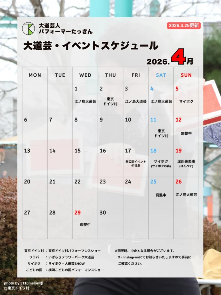 この記事は湘南の大道芸人・パフォーマーたっきんの2026年4月イベント・大道芸出演スケジュールをまとめています。